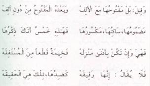 ). This school of thought as to tafkheem varies from the previous three level school in a few ways. First, the tafkheem letter with a fathah has two categories, that of a fath followed by an alif, and then a fathah not followed by an alif. This school also varies from the previous one in that the tafkheem letter with a sukoon has its own level of tafkheem, whereas the other school of thought has the saakin letter following the tafkheem level of the vowel on the letter preceding it. This means that there will be a difference of tafkheem between the saakin letters in this group, which are not affected by the vowel of the letter preceding it, and the other group which is totally affected by the vowel on the letter preceding it. For example, a saakin tafkheem letter preceded by a fathah in the three level school of thought, will have the highest ranking of tafkheem, whereas a saakin tafkheem letter of this five level school of thought, will have the 4th degree of tafkheem. Ash-Sheikh Al-Mutawali described the five levels of tafkheem in the following lines: