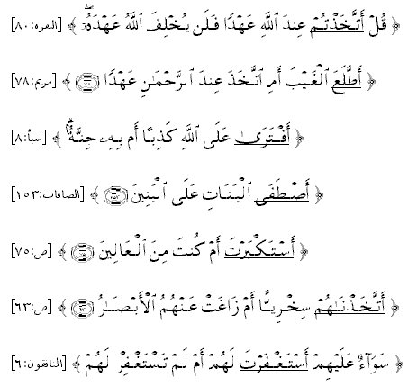 The above aayaat are all the cases of the hamzah qata' of questioning preceding hamzah al-wasl in verbs. As stated previously, hamzah al-wasl is dropped in writing and in pronunciation, and only