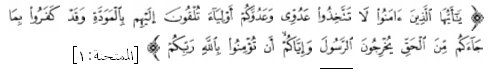 An interpretation of the meaning in English is: O you have believed, do not take My enemies and your enemies as allies, extending to them affection while they have disbelieved in what came to you of the truth, having driven out the Prophet and yourselves because you believe in Allah, your Lord.